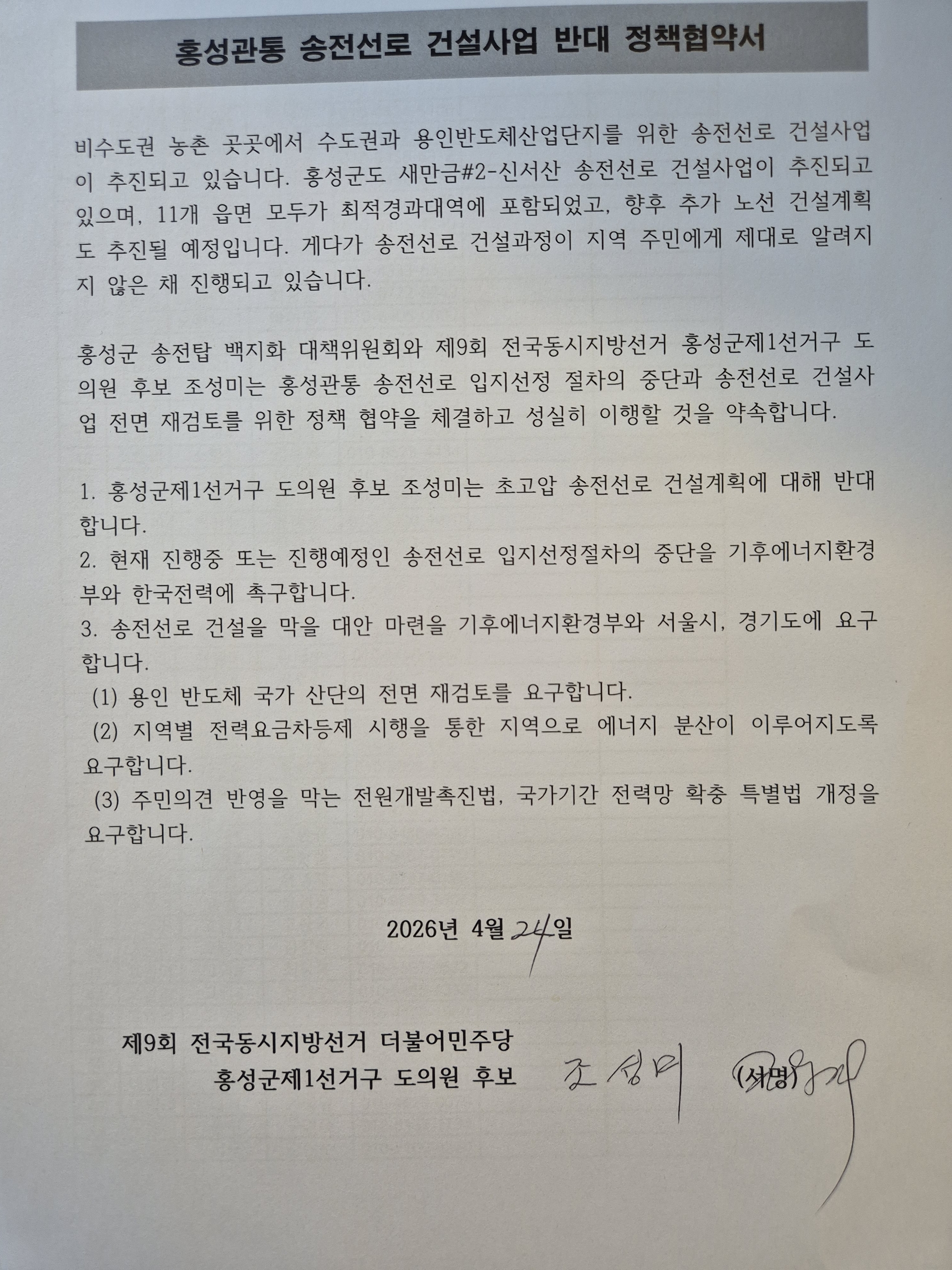 오늘 저는 홍성 송전탑 백지화 대책위원회가 제안한 '새만금#2-신서산 송전선로 건설사업 반대 정책협약'에 서명했습니다. 이 서명은 단순한 정치적 약속이 아닙니다. 평생을 생명 탄생의 현장에서 보낸 저 조성미가, 우리 아이들이 살아가야 할 이 땅의 안전을 지키겠다는 가장 엄중한 소명이자 결연한 의지의 표현입니다.