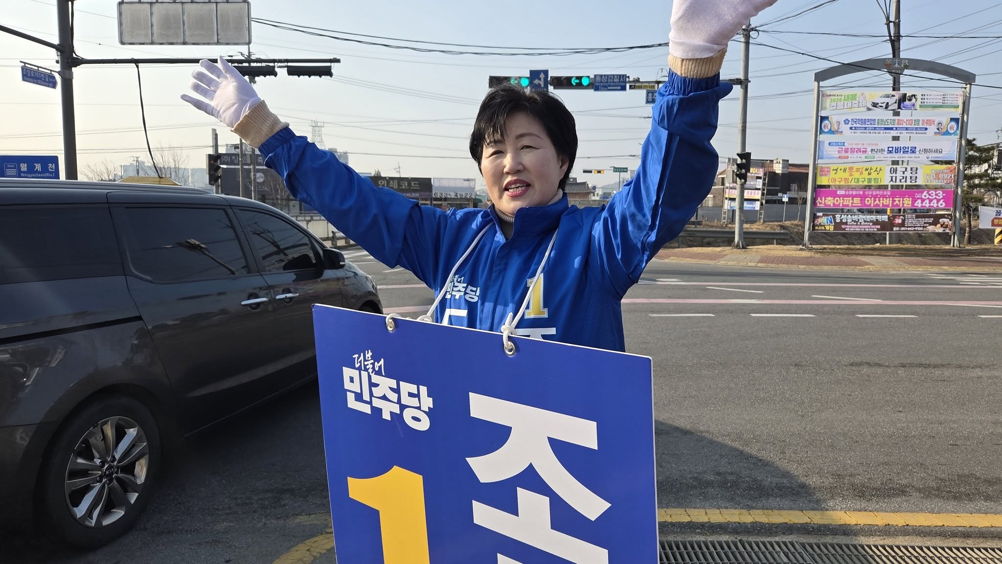 덕산 사거리에서 환하게 손 흔드는 조성미 예비후보
