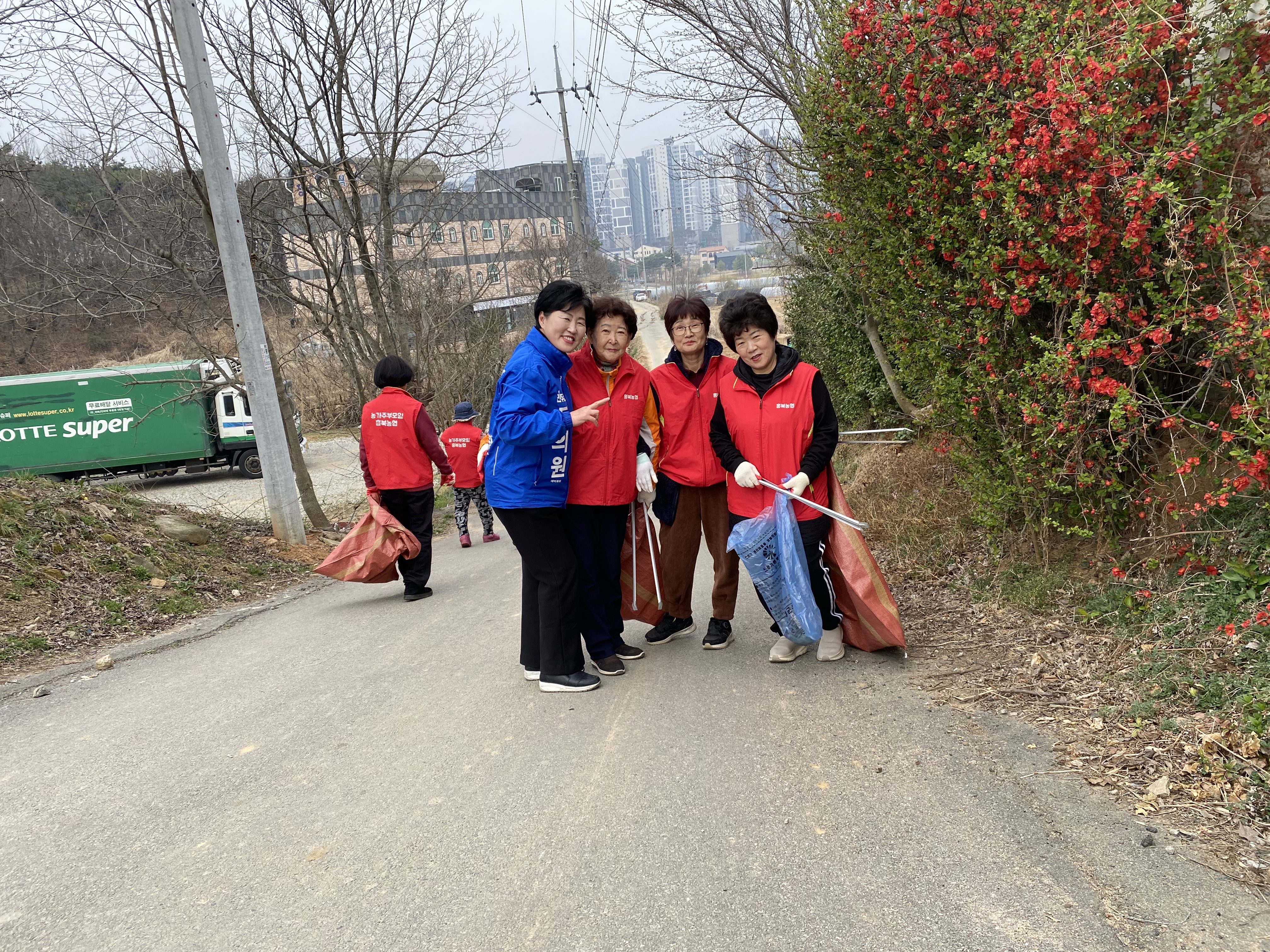 우리 주부님들, 농사일로 눈코 뜰 새 없이 바쁘신 분들이지만 오늘만큼은 손에 손에 집게와 마대자루를 들고 동네 정화 활동에 나섰습니다. 본격적인 농번기가 시작되어 바깥 활동이 더 많아지기 전에, 겨울내 쌓인 쓰레기를 치우고 깨끗하게 마을을 청소하기 위함입니다.