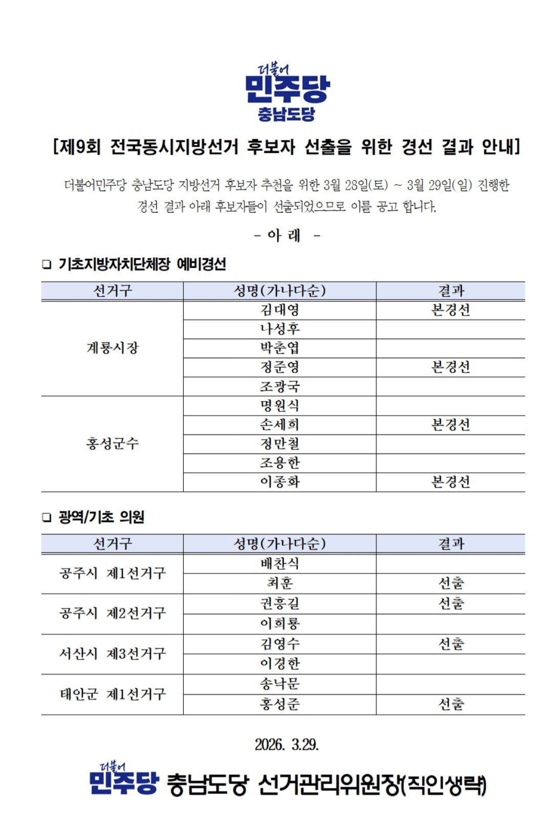 더불어민주당 충남도당의 발표에 따라, 홍성군수 본경선 진출자가 최종 결정되었습니다. 치열했던 예비경선 과정을 거쳐 손세희 후보님이종화 후보님이 본경선에 오르게 되었습니다.